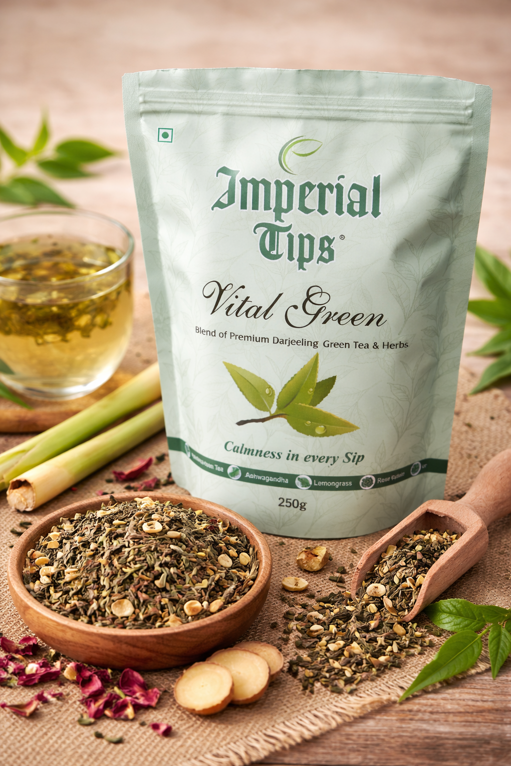 Imperial Tips Vital Green Tea is a refreshing wellness blend made from premium Darjeeling green tea leaves combined with carefully selected natural herbs. Crafted to promote calmness and balance, this tea delivers a light, soothing taste with gentle herbal notes—perfect for everyday wellness.