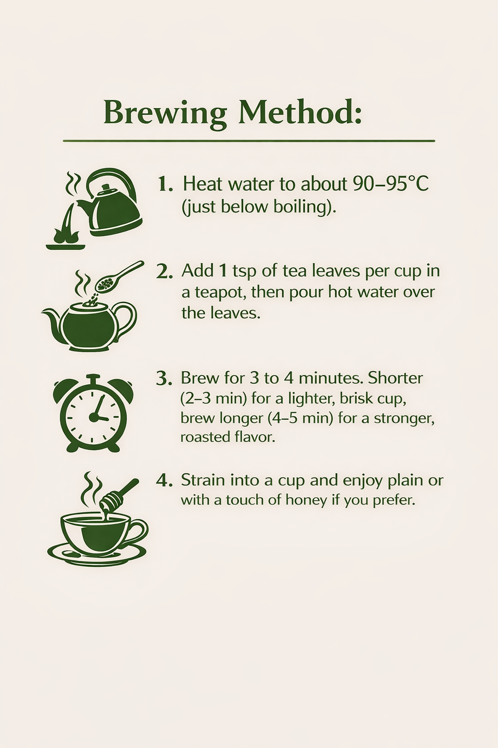 The tea leaves are clearly fresh and carefully selected. The taste is balanced—not too bitter, not too light. Perfect for morning energy or a relaxing evening.